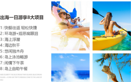 【贝尼达岛水上项目:浮潜+独木舟+海边秋千+泳池畅游+自助餐午餐】这里海水十分通透,水面离海底不深,水底景物清晰可见。在此地有最清澈的水晶海域浮潜,观赏各式热带鱼及缤纷的软硬珊瑚礁,在海上浮潜与美丽的鱼群一同嬉戏,深深地沉醉在大海的怀抱。并且还能在沿海海域玩独木舟:来到这里,无论你是独木舟高手或菜鸟,接受行前的教练说明,穿上救生装备,拿好划桨,准备出发啰!当然您如果不觉得过瘾,还能自费参加其他水上项目。